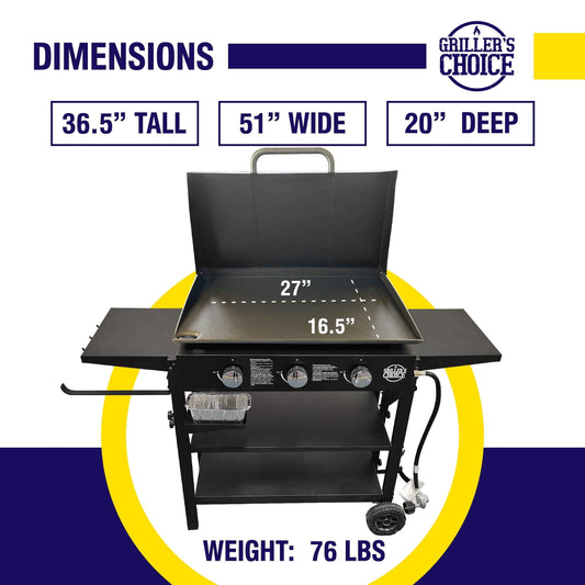 Griller's Choice Propane Gas Griddle with Hinged Hood, Wind Guards, Front Grease Management, 4 Shelves