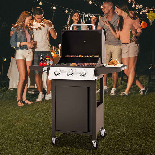 30000 BTU Gas Grill with 4 Universal Wheels, 3 Burners Outdoor BBQ Grill with Steel Brush & Thermometer for Outdoor Camping
