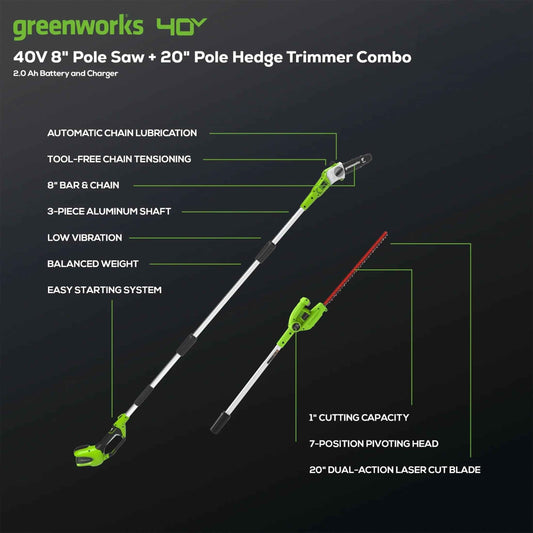 Greenworks 40V 20" Battery Powered Pole Saw with Hedge Trimmer Attachment + 2.0 Ah Battery and Charger