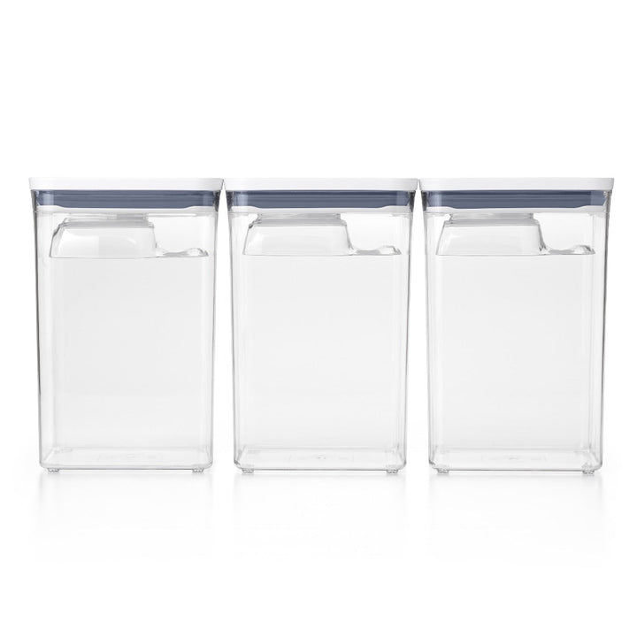 Stocking up on economy-size essentials? The OXO Good Grips 6-Piece POP Container Bulk Set is made just for you. Three 4.4 Qt Containers are perfect for storing bulk staples like coffee, sugar, and tea, and the three included ½ cup Scoops make measuring and serving a cinch. Airtight, stackable, space-efficient, and now completely dishwasher safe, these food storage containers can be customized to fit any space. With a handy fill line to guide you, curved corners for smooth dispensing and sturdy, BPA-free construction POP containers take tidying to the next level. POP Containers aren’t just for pantries: use them any place you want more organization. For best results, always use the button to open and close.