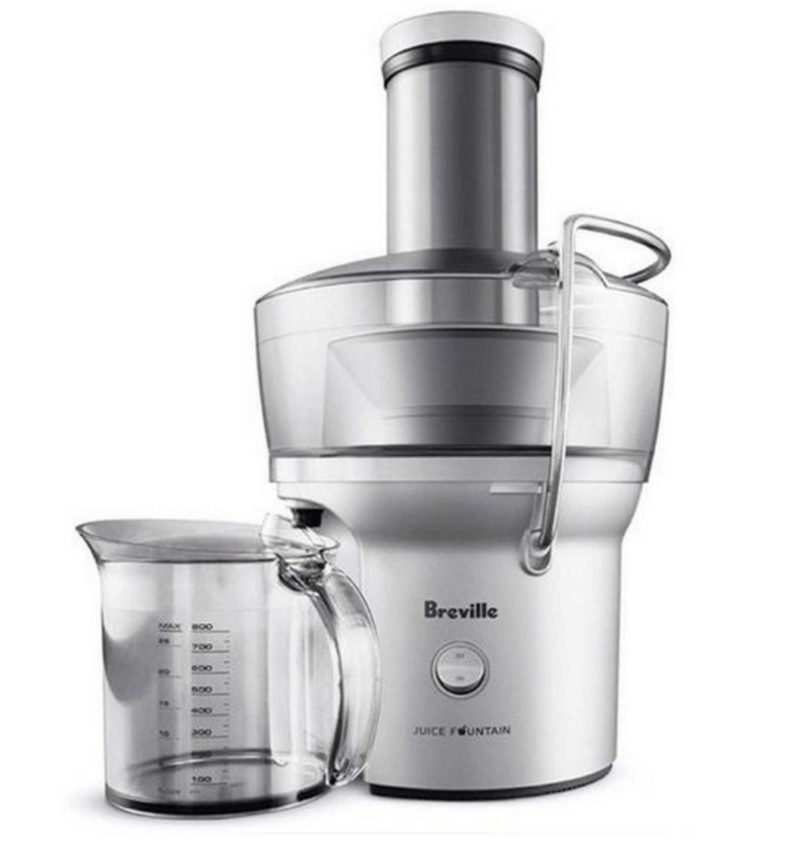 Breville Juice Fountain Compact Juicer Included Accessories: 25oz Juice Jug with Froth Separator. Cleaning Brush. Heavy Grade Polymer Body. Stainless Steel Cutters. The Juice Fountain Compact features Breville's unique extra wide chute feed...