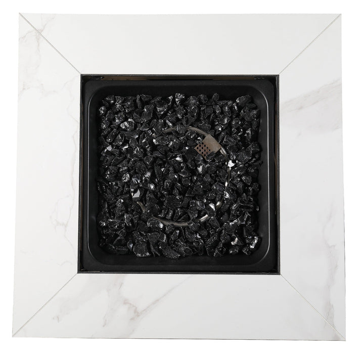 - This outdoor fire pit table includes a durable cover as well as high quality black fire glass