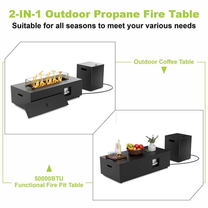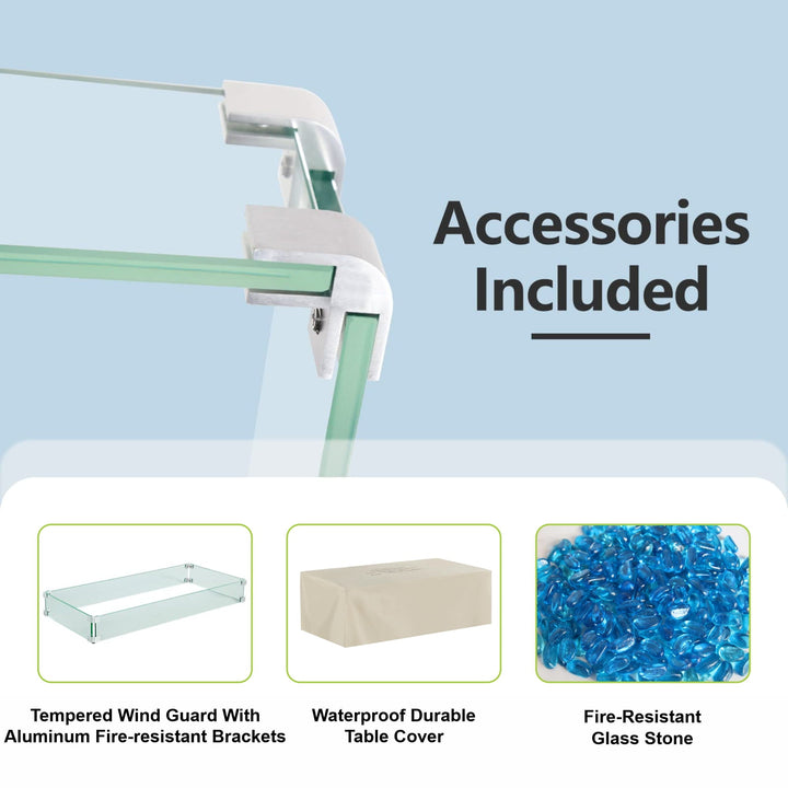 This Gas Fire Pit Table can be a perfect housewarming gift for a new home and can be used for friends and family barbecue gatherings throughout the year, no matter what the weather is like. Equipped with a powerful 50,000 BTU stainless steel burner with integrated ignition, it ensures a reliable and efficient flame.It can be switched to an outdoor dining table, coffee table,or even a propane fire pit when not burning. Plus, to provide you with a clean burning environment, this outdoor fire pit table is designed to use propane gas to keep you away from the trouble of ashes and smoke.It seamlessly combines aesthetics and practicality, making it an ideal addition to your holiday decor.