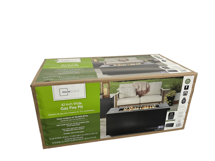 Experience relaxing evenings with memorable conversations and fun activities around a warm fire with the Mainstays Modern 42" x 20" Rectangular 50,000 BTU Propane Matte Black Steel Fire Pit Table with Tank Hideaway and Cover. The matte-black finish and modern design of this fire pit table make it a sophisticated centerpiece for any patio, terrace, or other outdoor area. Use it as a fire pit at parties to spark up some excitement or place the included lid on top to convert it into a coffee table for more intimate moments. It also includes a tank hideaway that fits a standard, 20-lb propane tank and doubles as a matching side table (tank sold separately), as well as a protective vinyl cover. The durable fire pit is constructed of steel and features an electronic ignition system, adjustable flame control, and a heat output of up to 50,000 BTUs. Enjoy a good book or pleasant conversation, or entertain with s’mores on cool nights next to the Mainstays Modern 42" x 20" Rectangular 50,000 BTU Propane Matte Black Steel Fire Pit Table, a stylish outdoor addition that provides warmth and ambience.