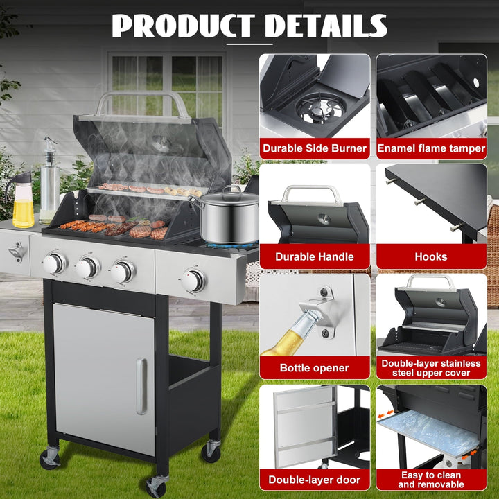 Nice Cooker 3-Burner Propane Gas Grill with Side Burner, 37000 BTU Outdoor BBQ Grill with Porcelain-Enameled Cast Iron Grates, Double Layer Lid, Built-in Thermometer Stainless Steel Grill for Outdoor
