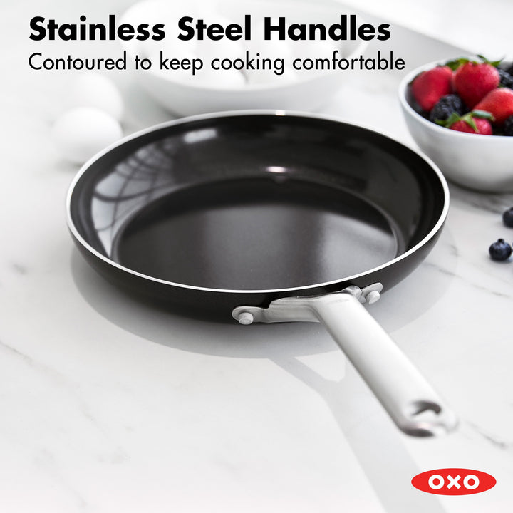 This 10” Frying Pan from the OXO Ceramic Non-Stick Agility Series is a do-everything size that will make any meal easier. This pan features a diamond-reinforced ceramic non-stick coating that delivers effortless food release with less oil. Cleanup is easy, plus our ceramic non-stick coating istoxin-free. The aluminum body heats quickly and evenly while the induction-ready base enhances performance on all stovetops. Oven safe up to 600˚F. Dishwasher safe.