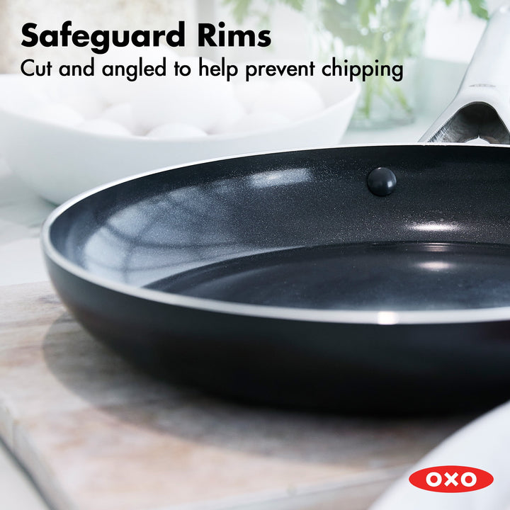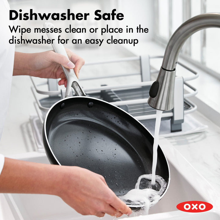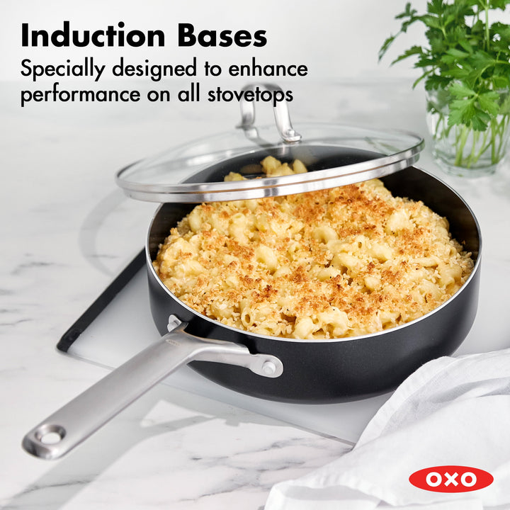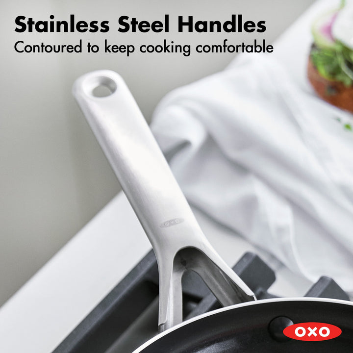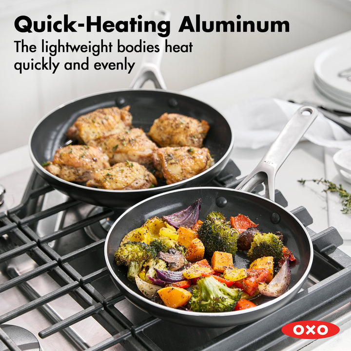 The OXO Non-Stick Agility Series is designed to make every meal faster and healthier. This set features a diamond-reinforced ceramic non-stick coating that delivers effortless food release with less oil. Cleanup is easy with the healthy nonstick coating. The aluminum bodies heat quickly and evenly while the induction-ready bases enhance performance on all stovetops. Oven safe up to 600˚F (lids up to 425˚F). Dishwasher safe.