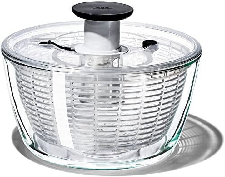 Elegant yet durable borosilicate glass bowl works for serving or storage,One-handed pump for maximum drying with minimum effort,Patented brake stops basket immediately with a simple press,Storage lock holds pump flush with lid for stacking and storing,Removable spinner basket works as a colander for rinsing greens,Easy-to-clean lid comes apart for thorough cleaning,Dishwasher Safe