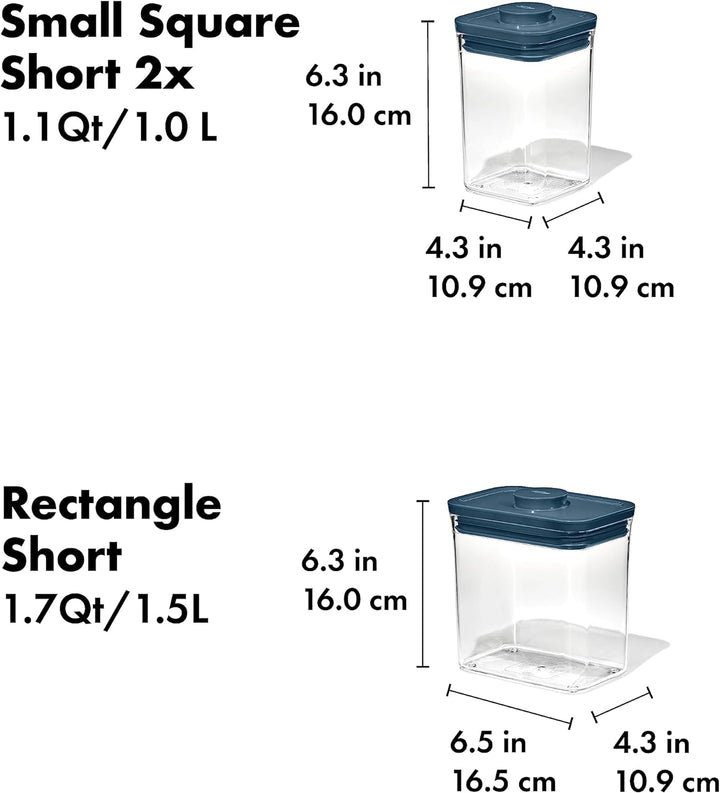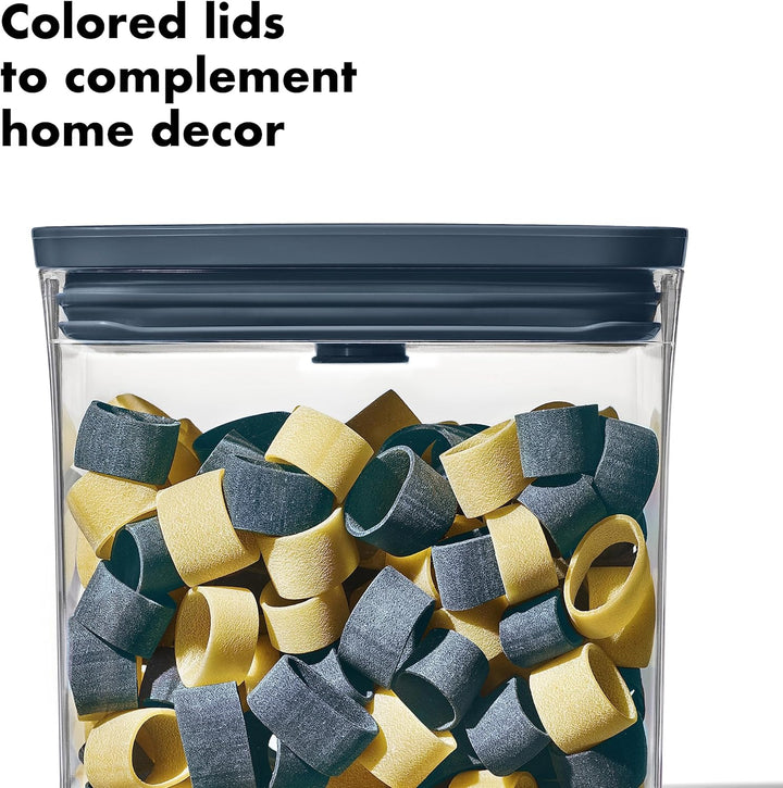 Brand OXO Color Storm Blue Material Plastic Capacity 1.04 Liters Product Dimensions 9"L x 9"W x 7.25"H About this item Limited edition Storm Blue lids Airtight seal with push of a button Set...