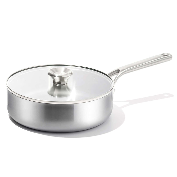 The OXO Mira 3-ply stainless steel collection is high-performance tri-ply built for modern kitchens. Discover professional quality cooking at home with this versatile sauté pan. It’s perfect for one-pan meals, braising, sautéing, and thousands of daily kitchen tasks. The pan is crafted with two stainless steel layers and a heat-radiant aluminum core to deliver fast and even cooking. A stain-resistant finish on the exterior prevents heat discoloration. A lightweight, contoured stainless steel handle keeps cooking comfortable while the streamlined rivets eliminate food traps for a seamless, snag-free interior. Permanent markings on interior walls are great for adding stock, water, milk and other liquid ingredients. A clear, tempered glass lid makes it easy to check the progress of your dish without losing heat and the double-duty knob works as a stand to create a rest area for tools and to keep your countertop clean. The durable, all-metal construction is perfect for all stovetops, including induction, and can move directly from the stovetop to oven or the broiler. Oven safe up to 600˚F, lid up to 425˚F. The tri-ply Mira collection is dishwasher safe for quick and easy cleanup.