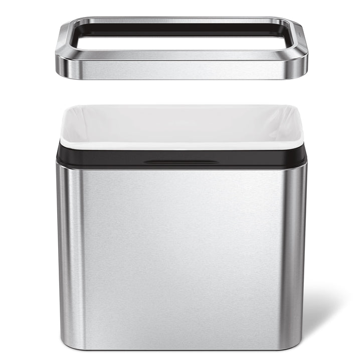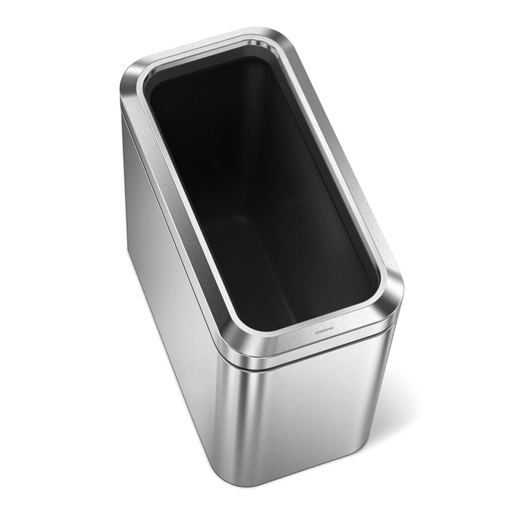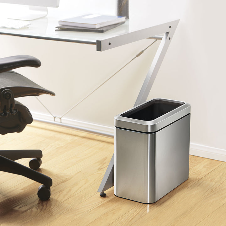 The simplehuman slim open can has a narrow, space-efficient shape that is perfect for hotel rooms or offices. A lift-off lid makes it easy to change the liner, and sturdy stainless steel construction...