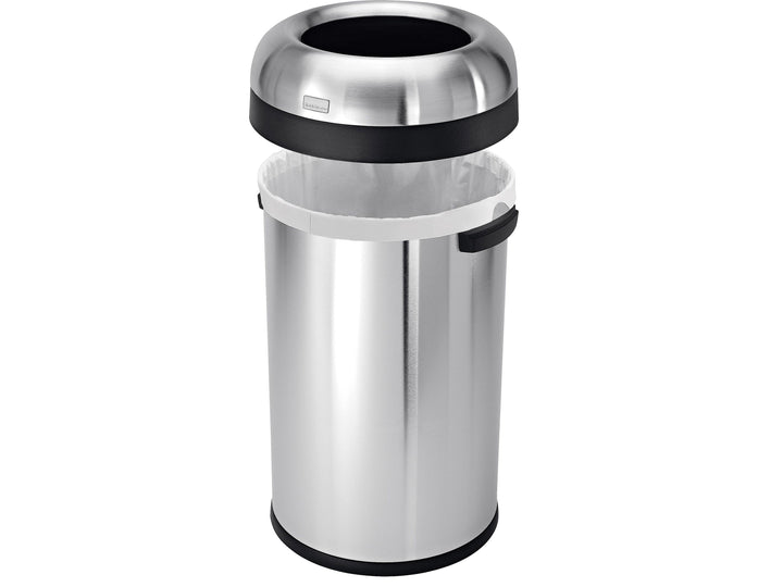 simplehuman's bullet open can has a 10.5-inch opening that makes it easy to scrape food off trays or toss in large items like pizza boxes. The heavy-gauge stainless steel construction, lift-off lid and extra-large capacity make it an ideal choice for high-traffic commercial spaces such as hotel lobbies, restaurants and commissaries.