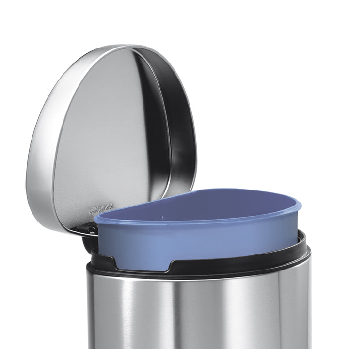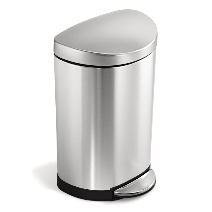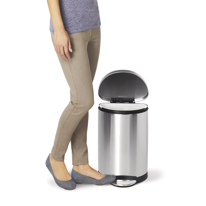 Maintain a tidy work space with this 2.6-gallon simplehuman stainless steel semi-round trash can.Keep the home or office clean and mess-free with this trash, which uses extra-strong custom fitted liners to keep garbage contained. This simplehuman wastebasket is engineered with a steel pedal for effortless, germ-free opening. Semi-round step trash can ensures clean and litter-free space and provides hands-free operation. Storage capacity of 2.6 gal. to easily accommodate all your waste. Made of brushed stainless steel to offer long-lasting use. Dimensions: 17.5"H x 11.2"W x 10.6"D. Flip lid opens easily and gently swings back into place, while lid shox technology controls the motion of the lid for a slow, silent close. Touch-free feature prevents the cross-contamination of germs. Fingerprint-resistant coating is easy to clean. Strong steel pedal is engineered to last 150000 steps — that is more than 20 steps a day for 20 years. Inner trash bucket is fully removable for easy emptying and cleaning. 10-year manufacturer limited warranty.The simplehuman space-efficient semi-round step can is perfect for smaller spaces like a bathroom or an office. The strong steel pedal is built to last, and lid shox technology ensures a smooth, silent close every time. A removable inner bucket makes for easy trash disposal.