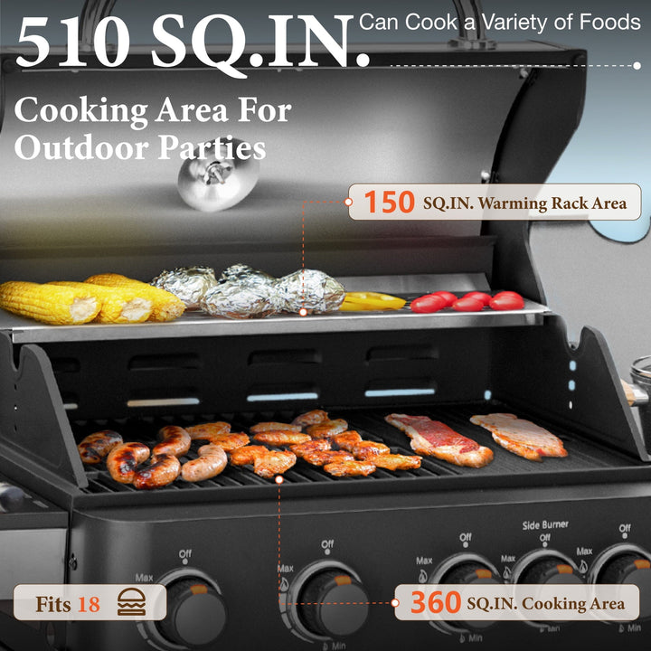 The Propane Gas Grill and Griddle Combo with Side Burner is a feature-packed BBQ grill made of stainless steel, offering a large 510 sq. in. cooking area with porcelain-enameled cast iron grates for even heat distribution. It's easy to clean, with a slide-out grease tray and a rotisserie kit option. With 4 stainless steel burners and an 8,500 BTU side burner, it delivers a total of 46700 BTU of cooking power. The double-layer lid and temperature gauge add convenience, while ample storage space and easy mobility with galvanized casters make it a versatile choice for grilling enthusiasts.