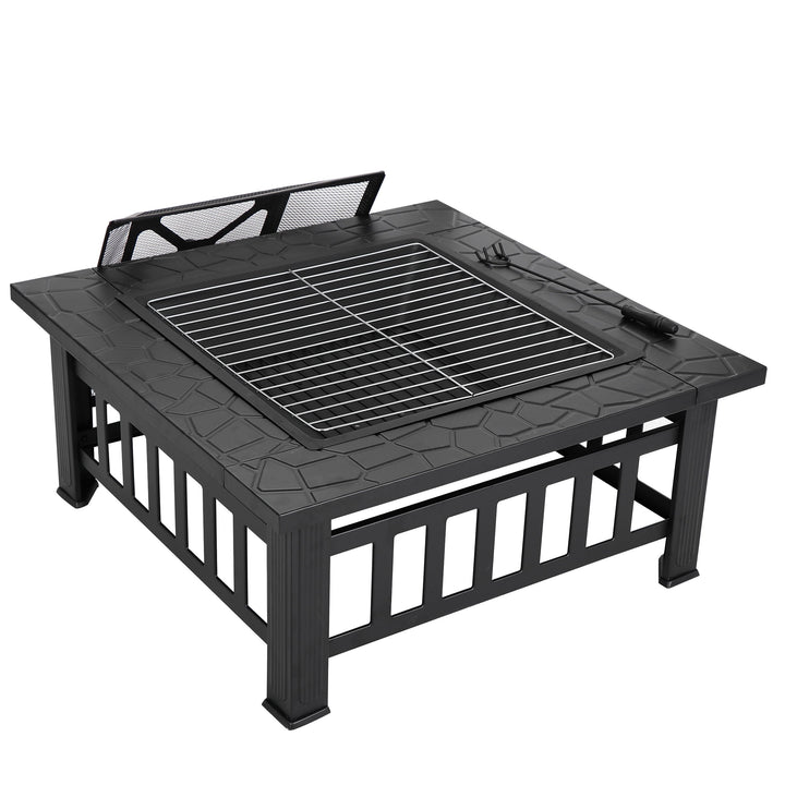 Thanks for choosing our products. This outdoor fire pit is made of solid and long-lasting black coated metal, it not only provides warmth but adds elegant decoration as a beautiful artwork. Item comes with a charcoal rack, Poker, grill, mesh cover, cloth cover, and instruction. It can work long time outside and keep rust resistant. Its mesh lid stops ashes and sparks from flying out and burning you. Ideal for any outdoor gathering, date, parent-child communication, or sit down alone. Beautiful patterns and a square clean line make it a perfect ornament in your garden, patio or backyard. A BBQ grill that has a surface that is safe for cooking and grilling food.